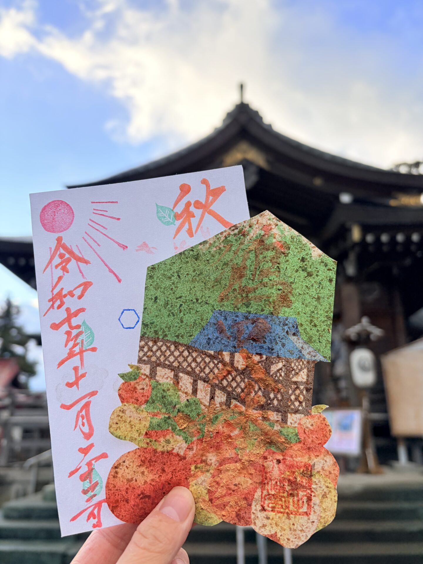 青森りんご御朱印 (GS546) 青森県産りんごの残渣(搾りかす等)を使用した御朱印です。 ※記帳できる印は、太陽・雲・風・雨・雷・葉っぱ・空飛ぶ鳥・飛行機雲・幾何学模様・とんぼ・渡り鳥の印となります。 初穂料¥1,200数量
